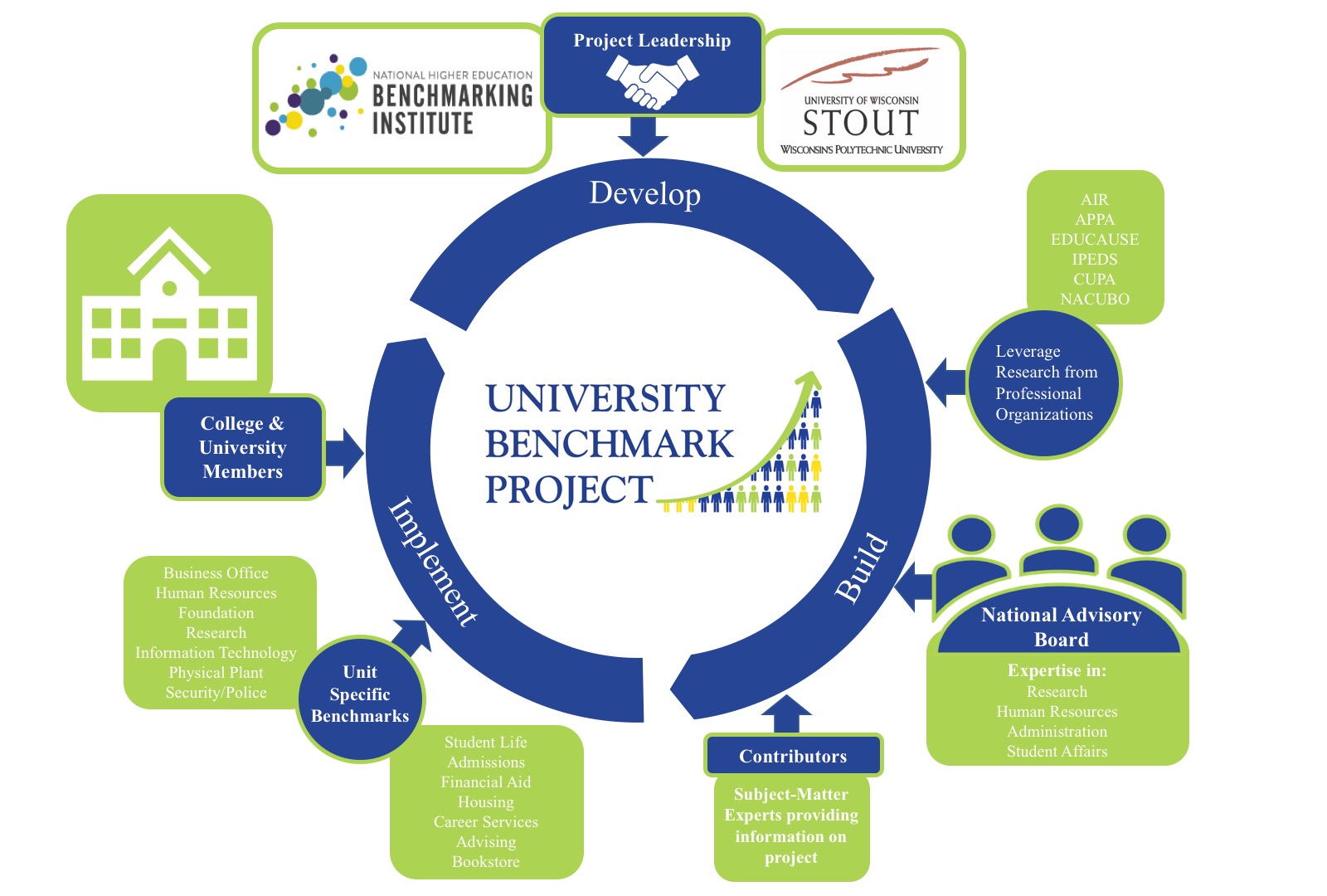The University Benchmark Project: Educational Support Services collects standardized information from administrative and student support services divisions in four-year universities and colleges and was developed in partnership by the University of Wisconsin - Stout and the National Higher Education Benchmarking Institute with input from an advisory board of higher education professionals from colleges across the country. This national initiative's goal is to collect standardized information from 4-year institution's administrative and student support services divisions.