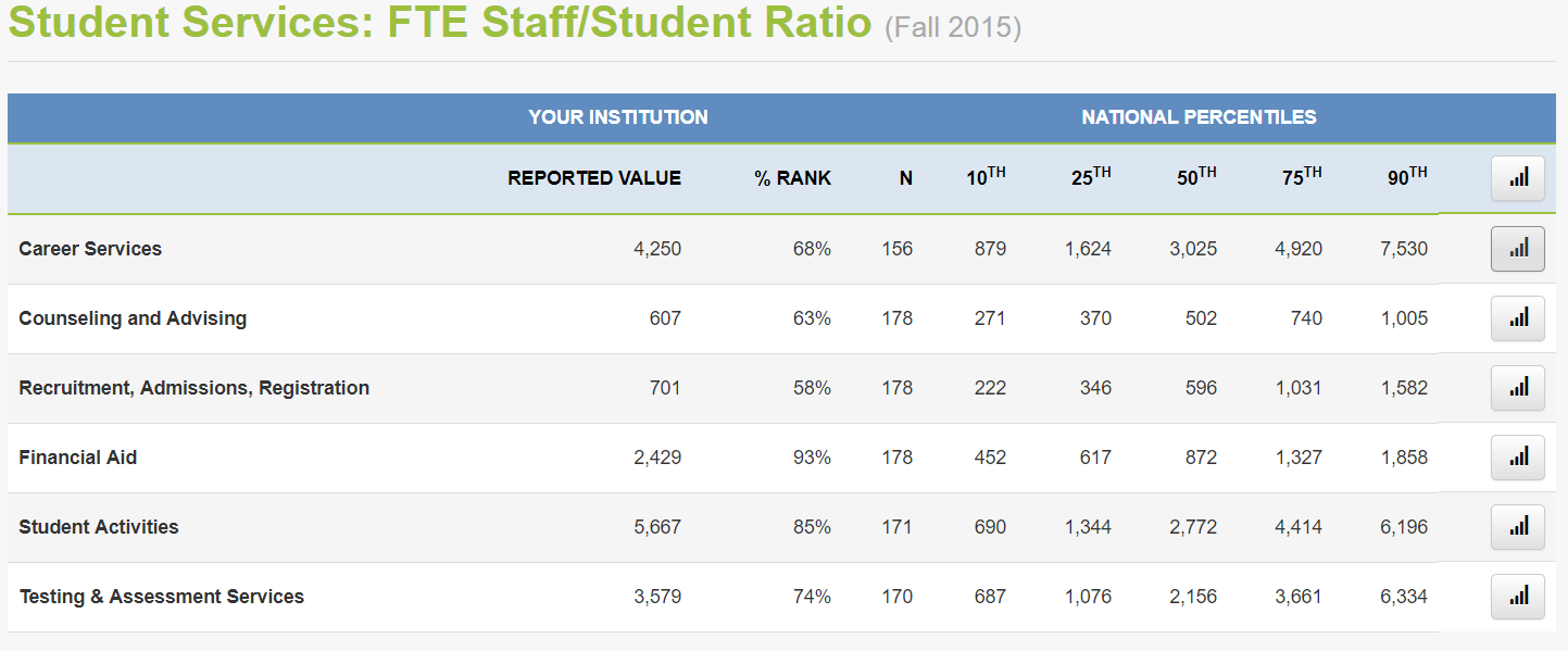 Members can delve into a vast set of benchmarks to get a dynamic view of how their universities and colleges compares to regional and national standards and peer institutions by using various criteria: enrollment, location, mission, size, and more.